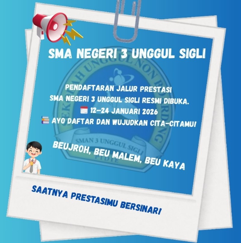 SMA Negeri 3 Unggul Sigli membuka Penerimaan Peserta Didik Baru Tahun Ajaran 2026/2027 melalui Jalur Prestasi.